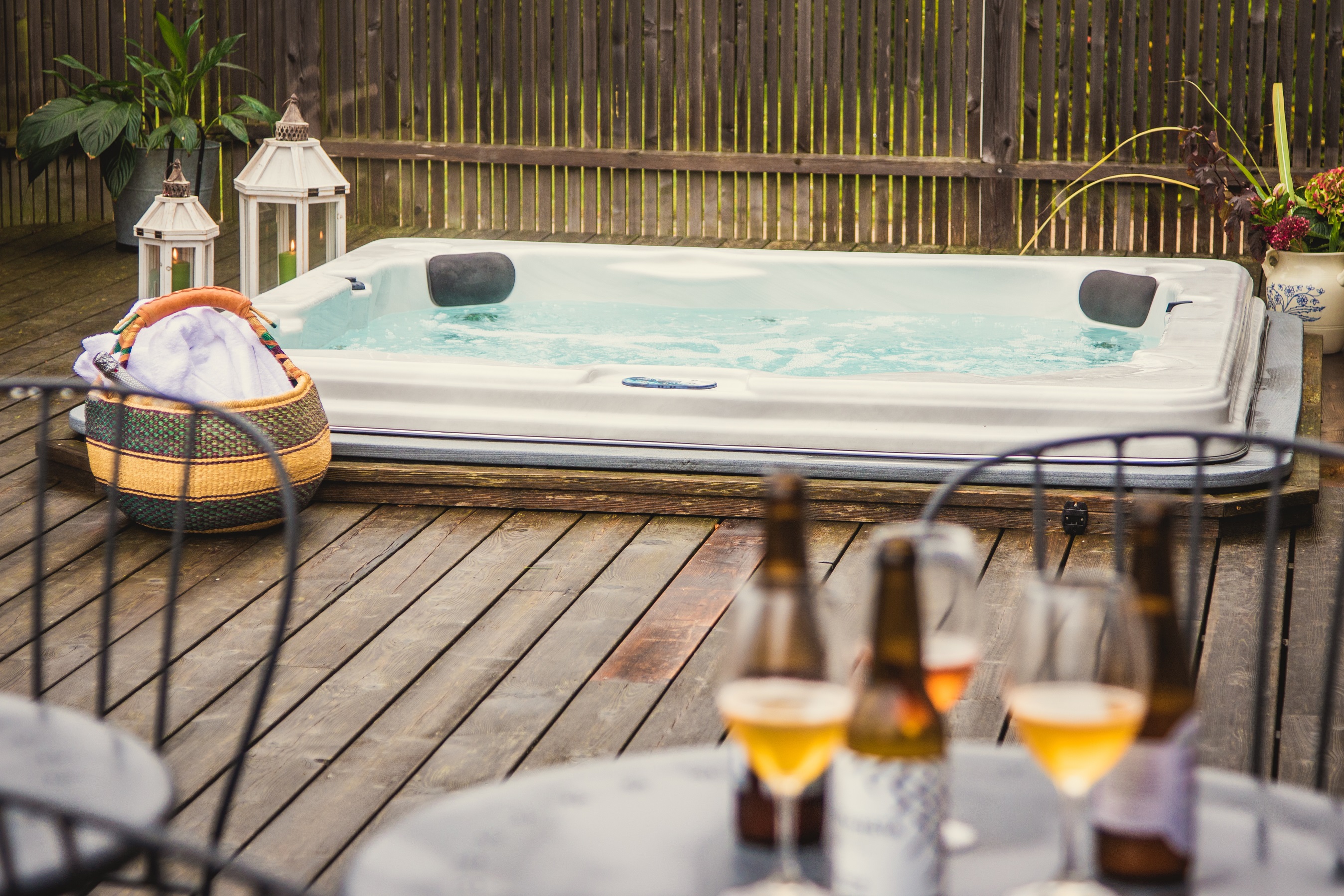 Trädgård med olika sittgrupper för avslappning och två utomhusspa som ni kan boka på plats.